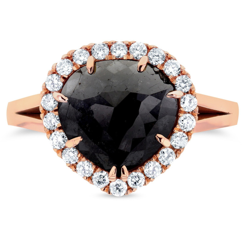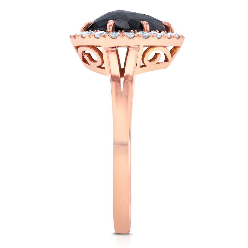 Ladies fourteen karat rose gold split shank black and white diamond ring. The halo features natural white diamonds weighing approximately a total of 1/3 carat. Their clarity grades are I1-I2. Their color grades are G-H. The center pear shape black diamond weighs 2 2/5 carats. This treated black diamond shines in all angles from the beautiful rose-cut facets. As with any black diamond, the stone is color treated for consistency to ensure a beautiful even tone.