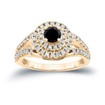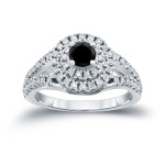 This 14k diamond halo engagement ring features a dazzling 2/5ct TDW round black diamond center stone in prong setting surround blacked by 69 small round cut diamond side stones. Crafted of your choice of 14-karat white, yellow or rose gold and completed with a high polish finish.