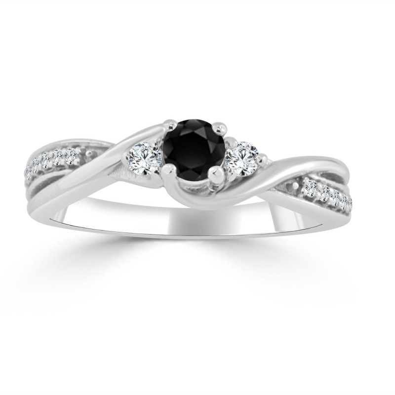 A twisted shank design gives this ring a modern flair. This ring showcases a 1/5ct black dimaond center stone surrounded by 14 small diamonds in prong setting. Beautifully crafted in 14k white, yellow or rose gold in high polish finished.