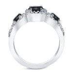This halo diamond engagement ring showcases 3 dazzling 4/5ct TDW round black diamond center stones in prong setting surrounded by 44 smaller round-cut diamond side stone. Crafted of fine platinum metal and completed with a high polish finish.