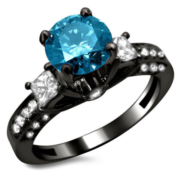 Black Gold 1 1/2ct 3-stone Blue and White Round Princess Cut Diamond Engagement Ring - Handcrafted By Name My Rings™